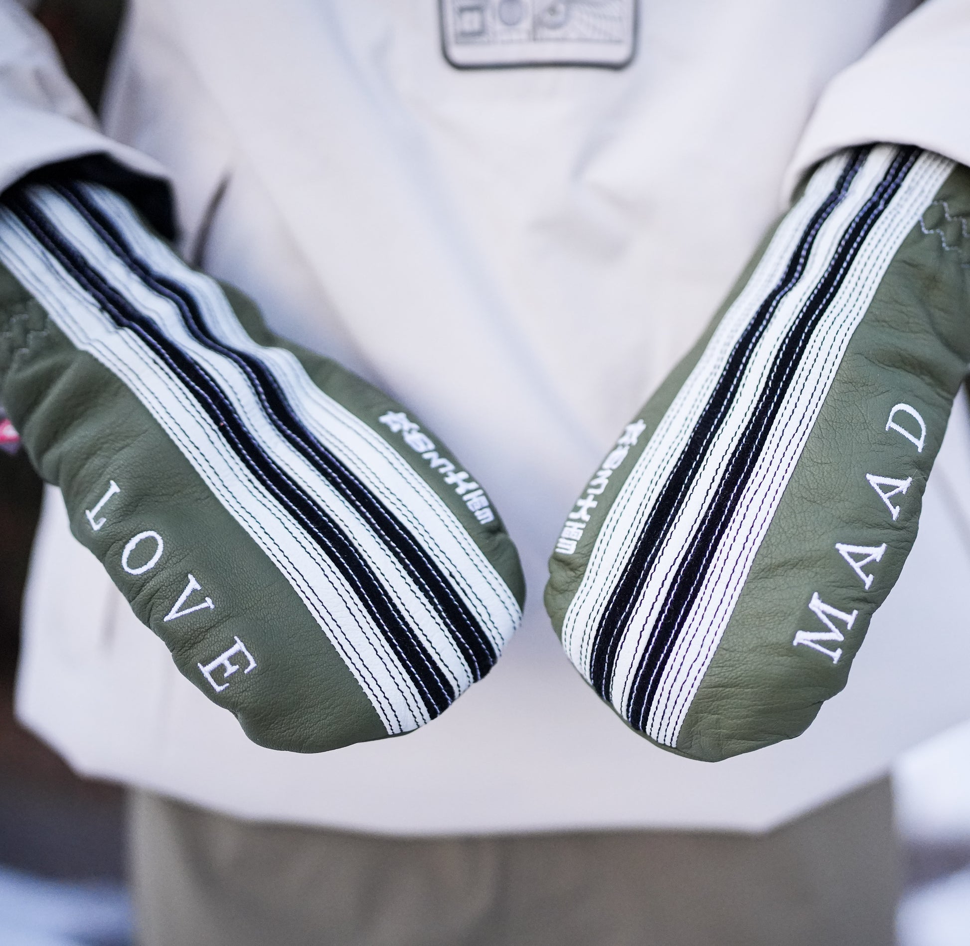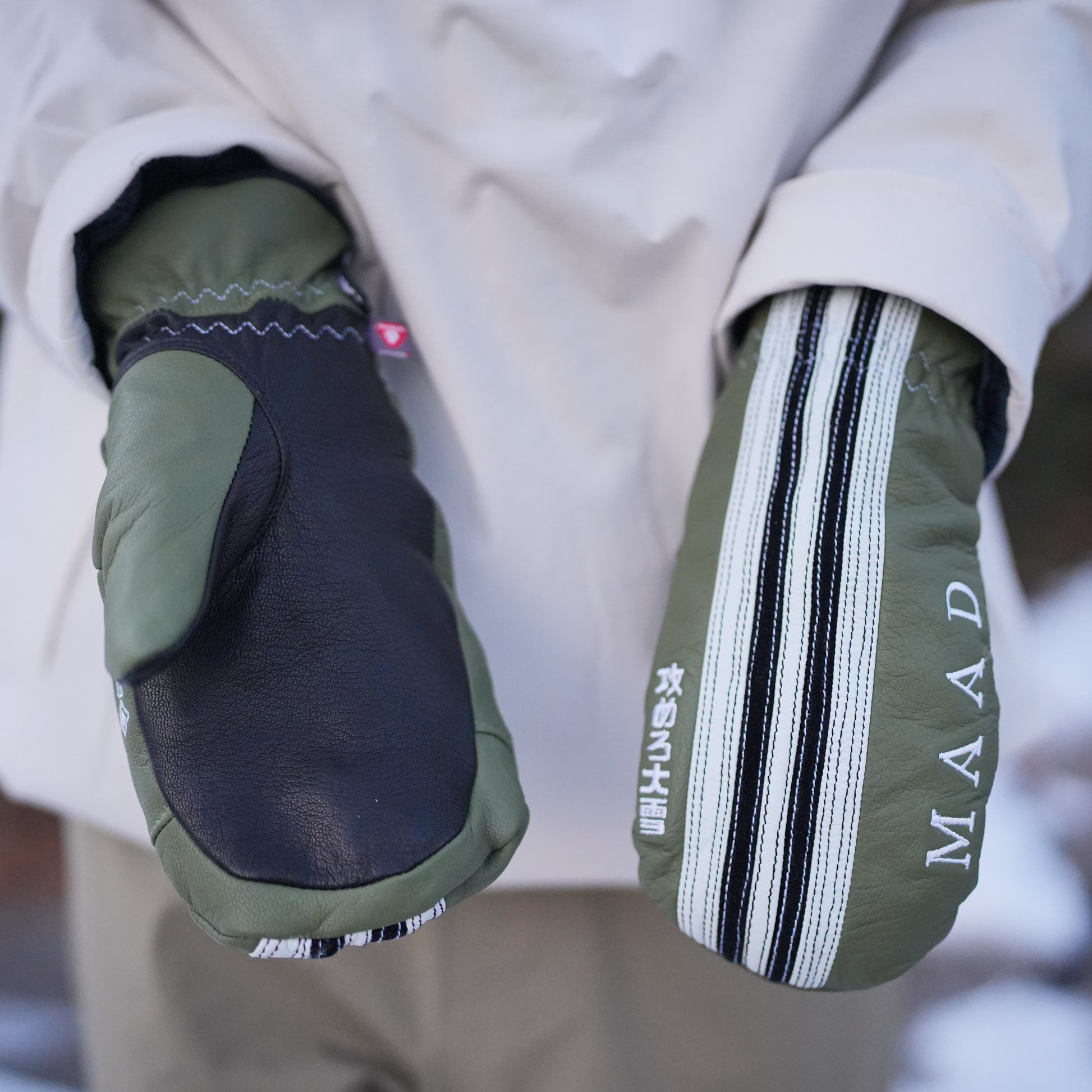 Our mitts membrane is made of GORE-TEX waterproof breathable insert to keep you 100% dry™. Maad's mitt have a PrimaLoft® Gold insulation to keep you real warm and we used a black premium water resistant goatskin leather for the palms. They come in an option of two colorway of White, Payaya Orange and Japan red.